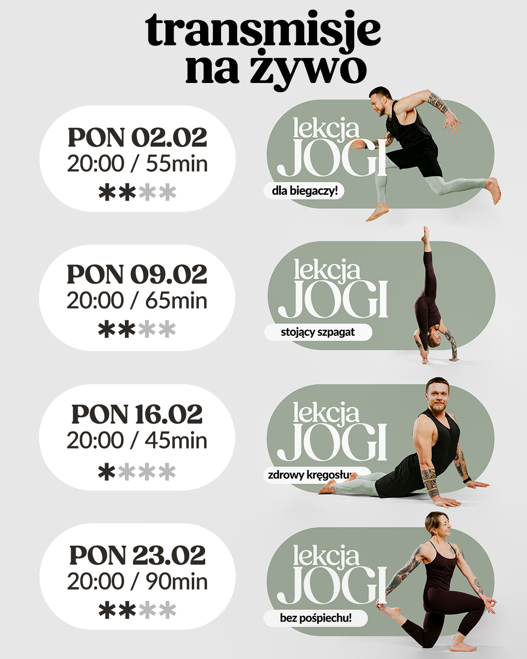 Na każdy miesiąc przygotowujemy przemyślany, spójny i inspirujący grafik ćwiczeń na które Was zapraszamy. Dzięki temu możecie zaplanować sobie z wyprzedzeniem te w których chcecie wziąć udział. Wybierz poniżej tydzień miesiąca, który Cię interesuje i zobacz jakie zajęcia przygotowaliśmy na obecny miesiąc. Kliknij na praktykę, która Cię interesuje, a zostaniesz przeniesiony na nasz kanał YouTube, gdzie odbywają się praktyki.