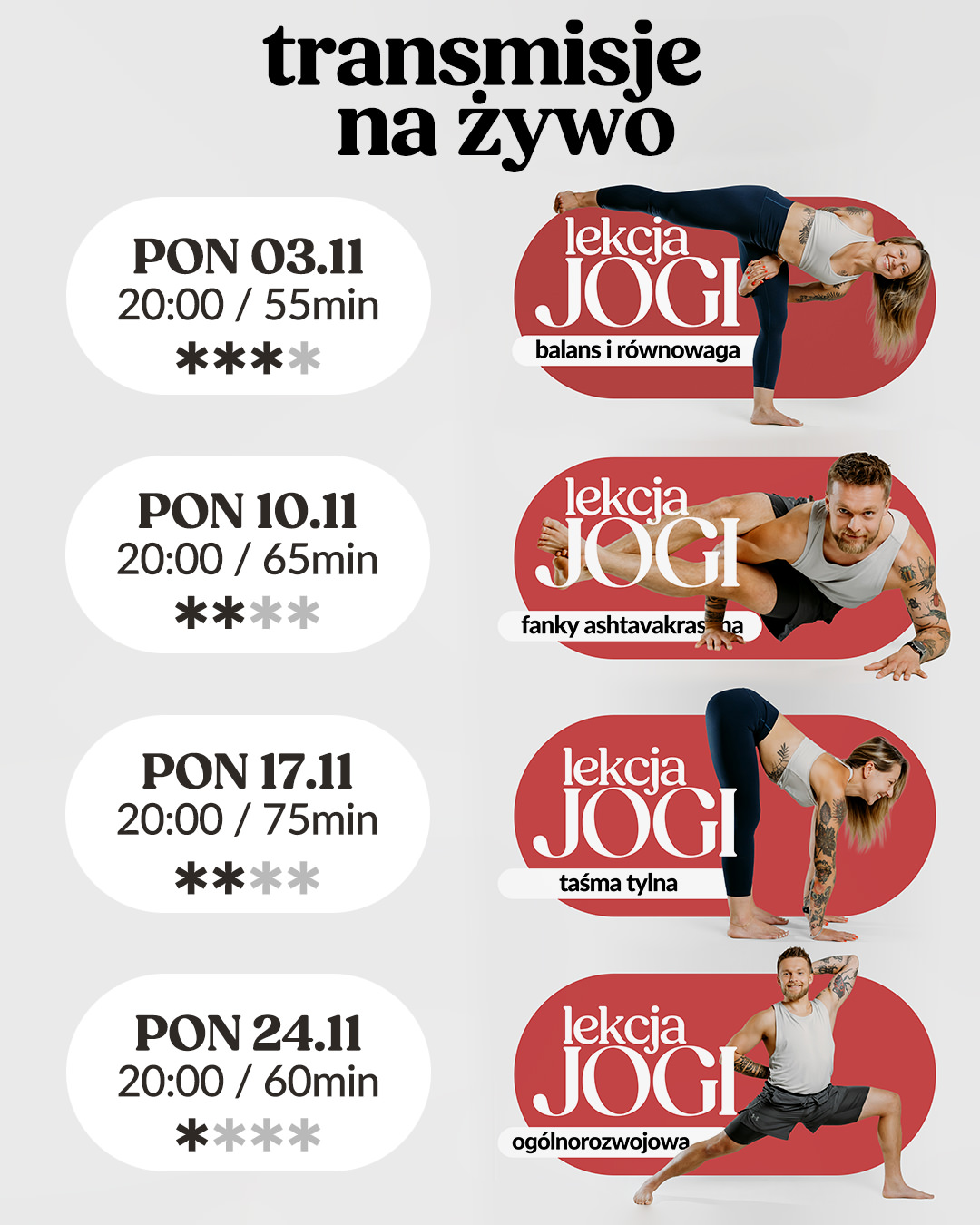 Nie zdążyłaś/eś na zajęcia? Chcesz wrócić do pewnych zagadnień? A może ćwiczysz o bardzo dziwnych porach? Nie martw się – prawie wszystkie nasze praktyki możesz odtworzyć nawet po czasie ich emisji na żywo. W celu łatwiejszej nawigacji i wyboru odpowiednich, interesujących Ciebie zajęć joga online pogrupowaliśmy je w tak zwane playlisty. Śmiało wybierz z poniższych temat najbliższy Twoim zainteresowaniom: