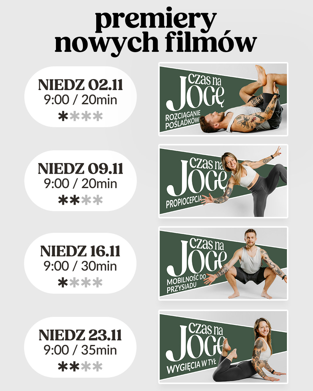 Na każdy miesiąc przygotowujemy przemyślany, spójny i inspirujący grafik ćwiczeń na które Was zapraszamy. Dzięki temu możecie zaplanować sobie z wyprzedzeniem te w których chcecie wziąć udział. Wybierz poniżej tydzień miesiąca, który Cię interesuje i zobacz jakie zajęcia przygotowaliśmy na obecny miesiąc. Kliknij na praktykę, która Cię interesuje, a zostaniesz przeniesiony na nasz kanał YouTube, gdzie odbywają się praktyki.