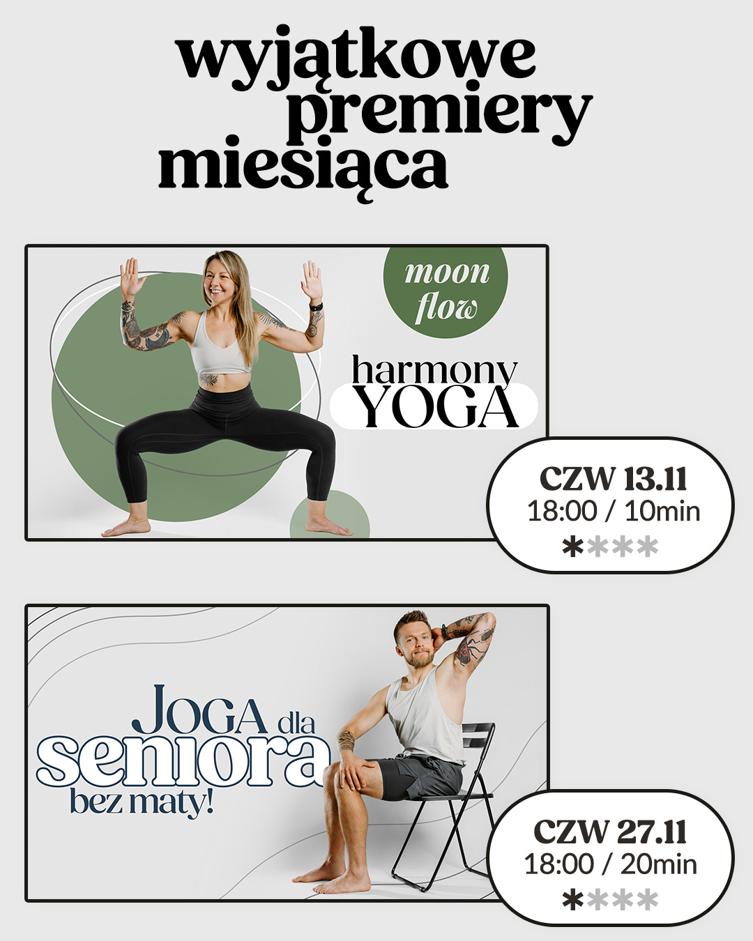 Na każdy miesiąc przygotowujemy przemyślany, spójny i inspirujący grafik ćwiczeń, na które Was zapraszamy. Dzięki temu możecie zaplanować sobie z wyprzedzeniem te, w których chcecie wziąć udział. Poniżej obecny miesiąc podzielony na kolejne tygodnie. Możesz przeglądać je przesuwając grafiki w lewo i w prawo lub klikając na kropki pod nimi. PRZEJDŹ DO YOUTUBE