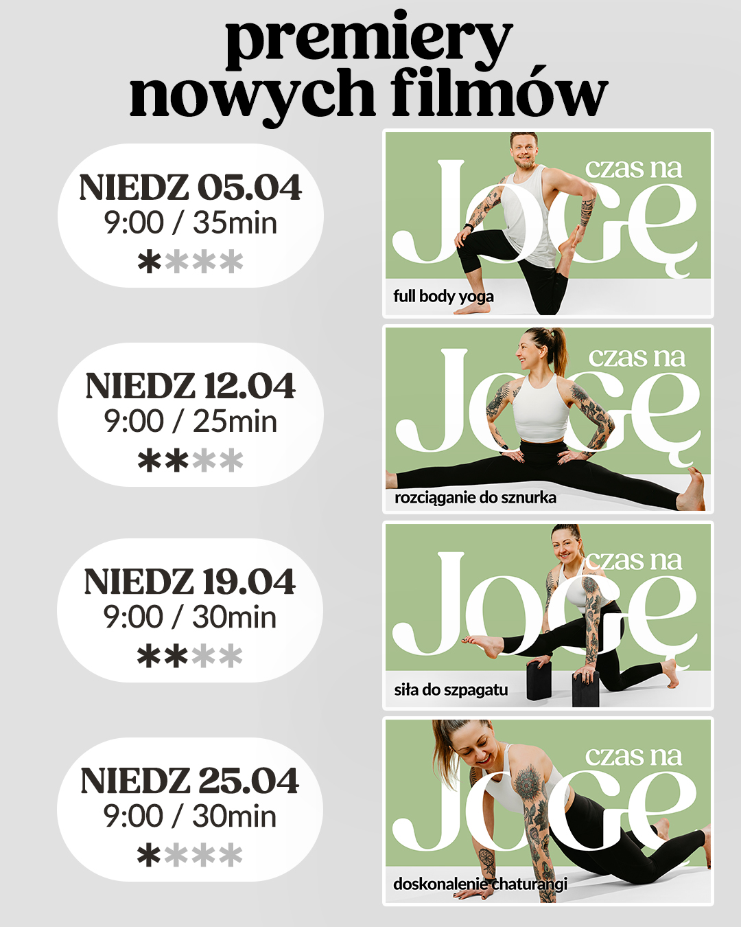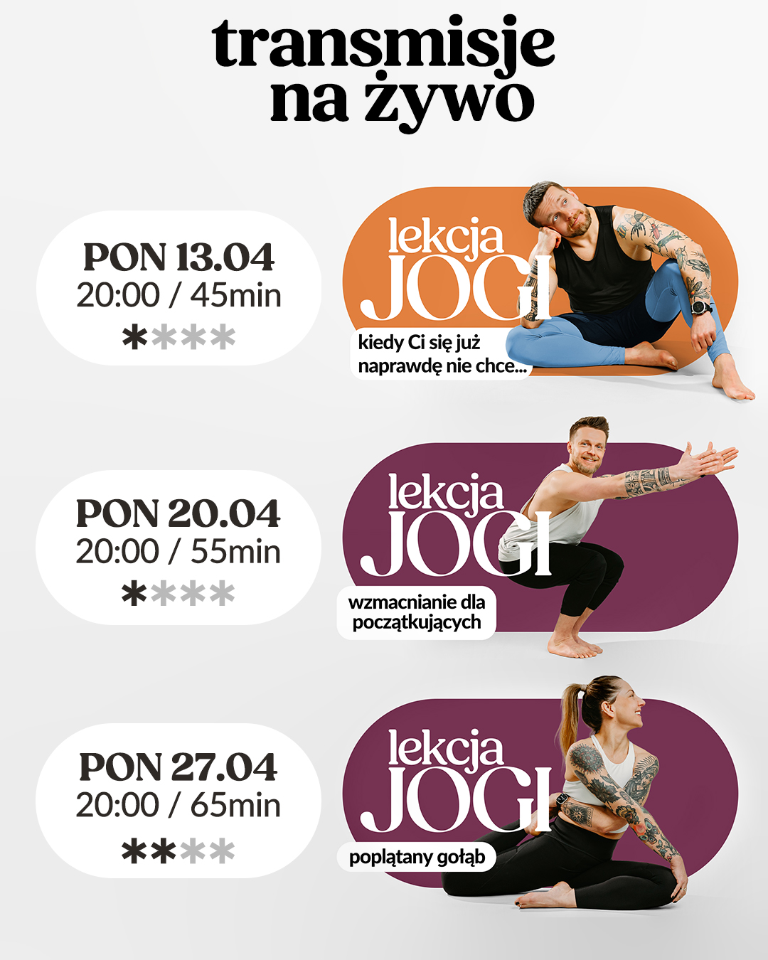 Na każdy miesiąc przygotowujemy przemyślany, spójny i inspirujący grafik ćwiczeń na które Was zapraszamy. Dzięki temu możecie zaplanować sobie z wyprzedzeniem te w których chcecie wziąć udział. Wybierz poniżej tydzień miesiąca, który Cię interesuje i zobacz jakie zajęcia przygotowaliśmy na obecny miesiąc. Kliknij na praktykę, która Cię interesuje, a zostaniesz przeniesiony na nasz kanał YouTube, gdzie odbywają się praktyki.