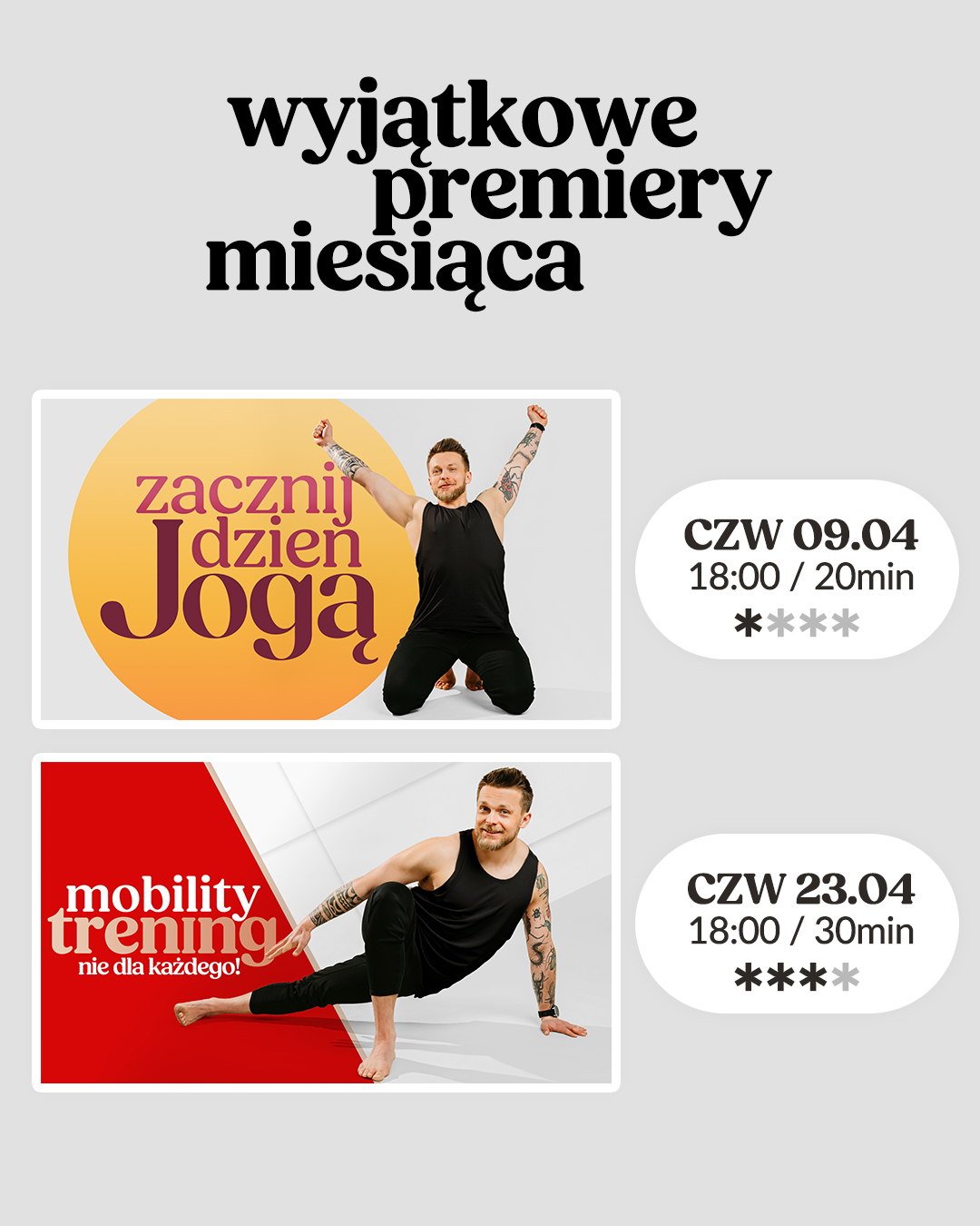 Na każdy miesiąc przygotowujemy przemyślany, spójny i inspirujący grafik ćwiczeń, na które Was zapraszamy. Dzięki temu możecie zaplanować sobie z wyprzedzeniem te, w których chcecie wziąć udział. Poniżej obecny miesiąc podzielony na kolejne tygodnie. Możesz przeglądać je przesuwając grafiki w lewo i w prawo lub klikając na kropki pod nimi. PRZEJDŹ DO YOUTUBE